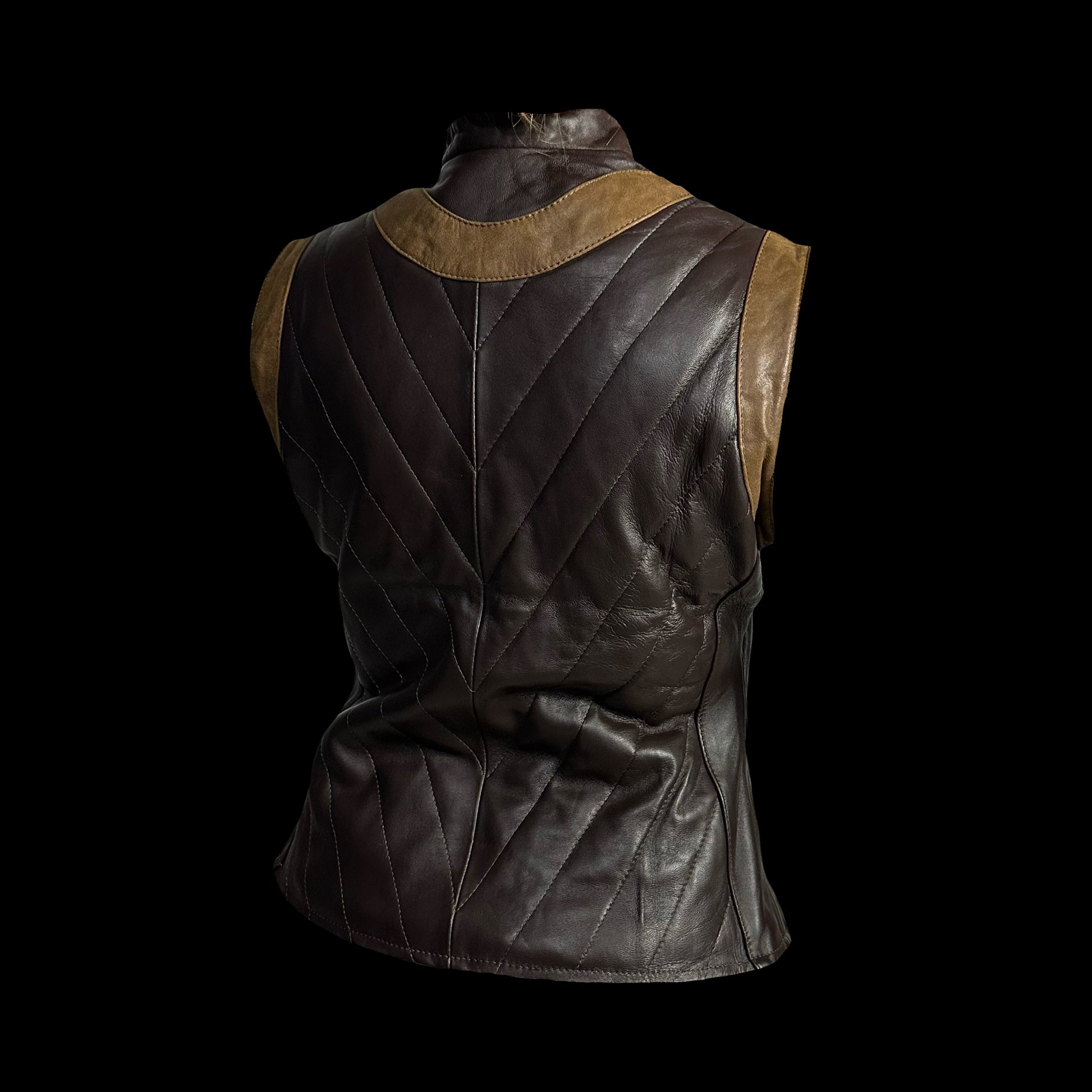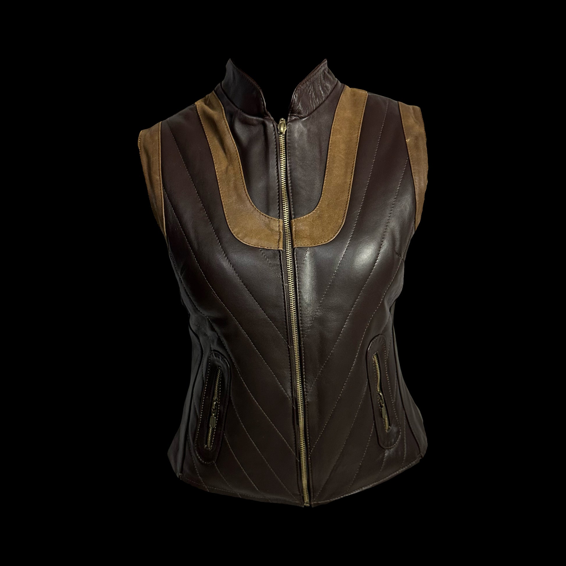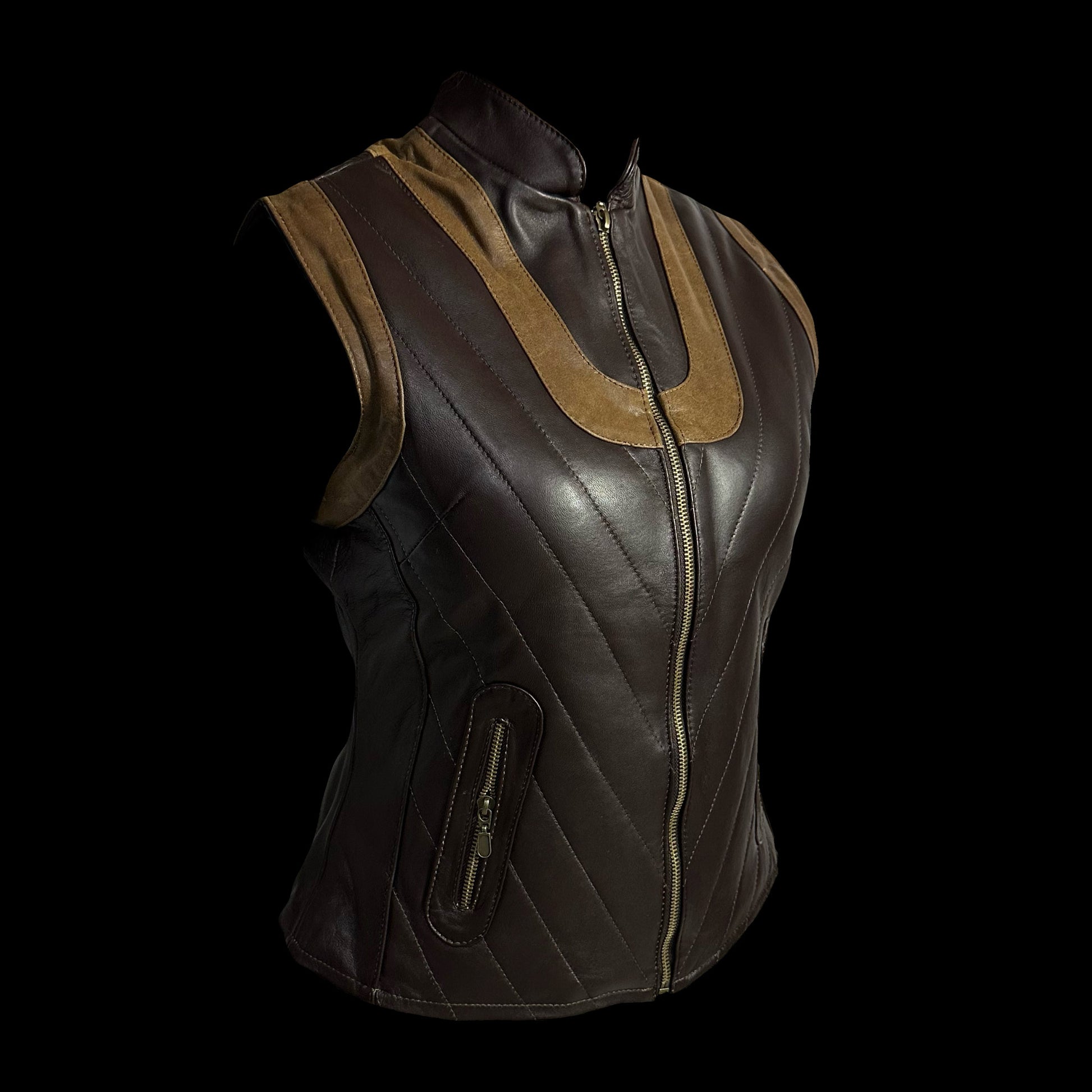 ¡Descubre el chaleco Amanda de piel en color Chocolate ! Con su diseño único y sofisticado acabado, este chaleco añade un toque de estilo audaz a tu guardarropa.
