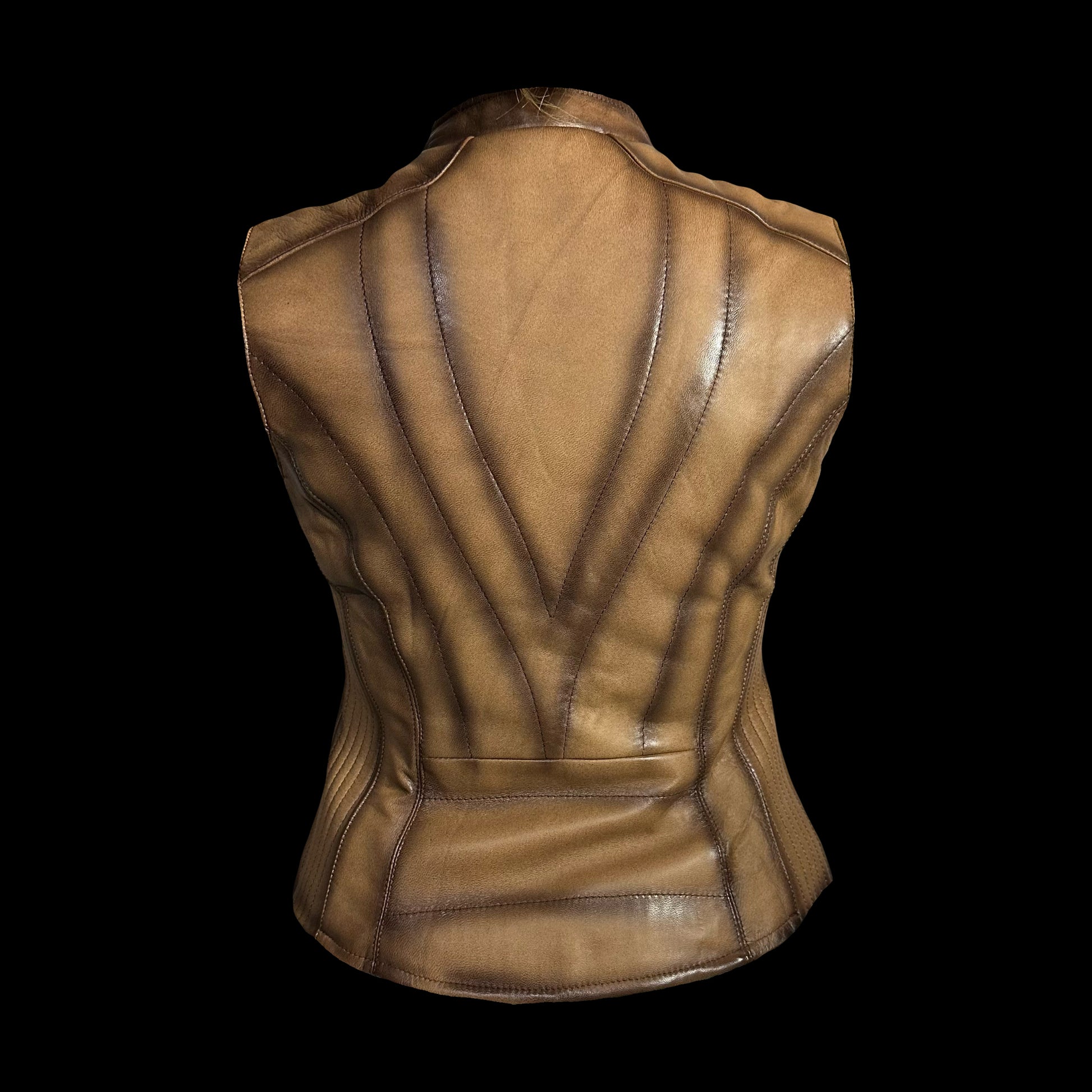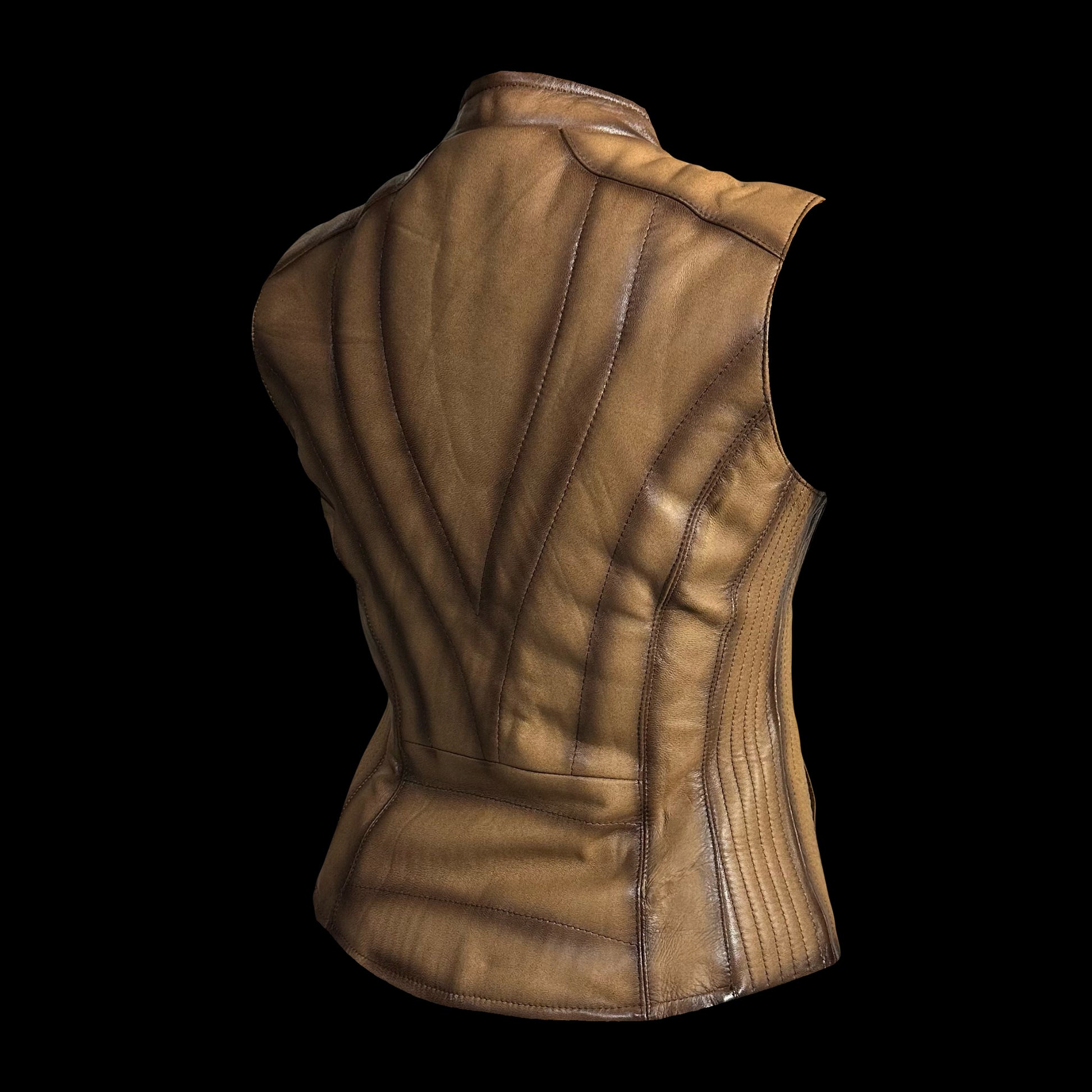 ¡Descubre el chaleco de piel en color Miel! Con su diseño único y sofisticado acabado, este chaleco añade un toque de estilo audaz a tu guardarropa.