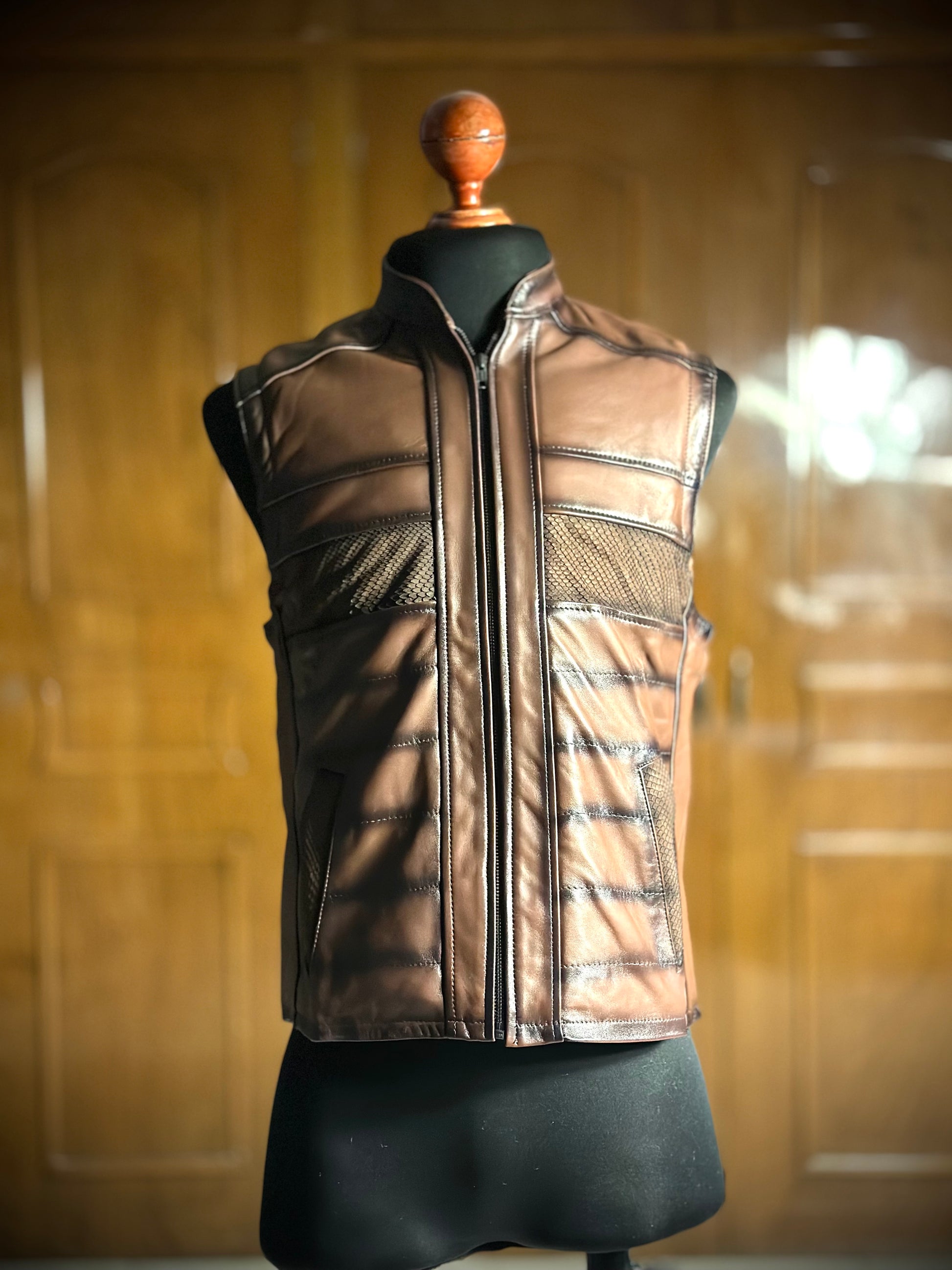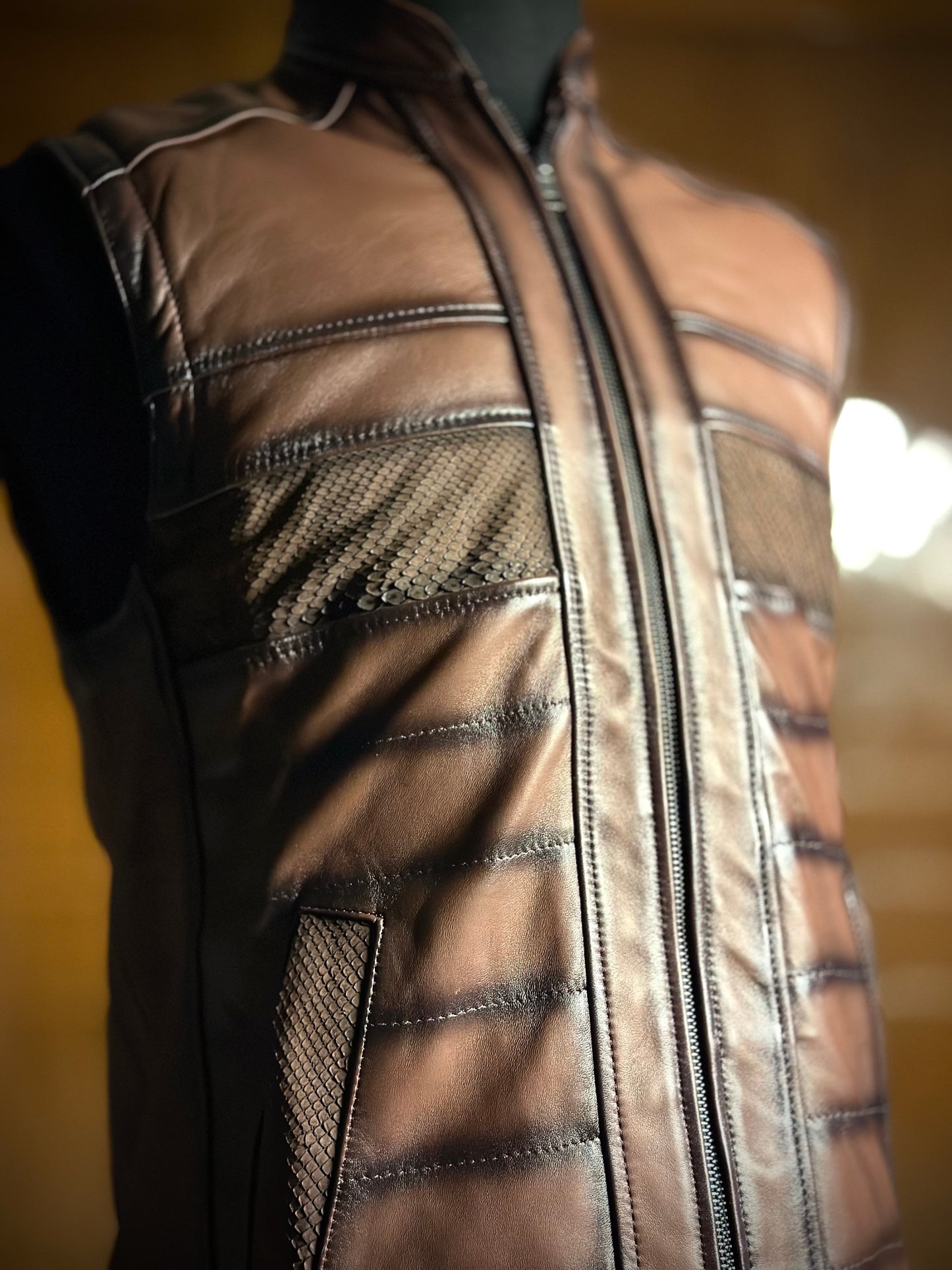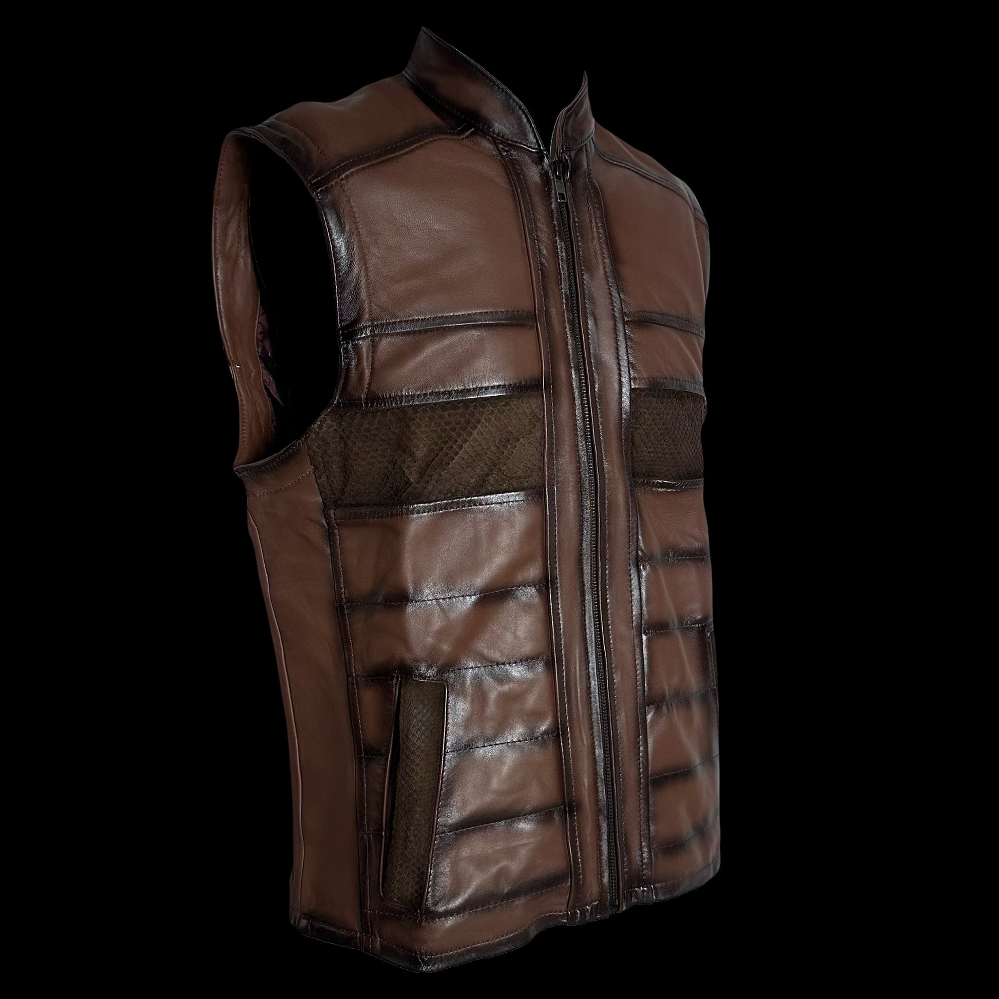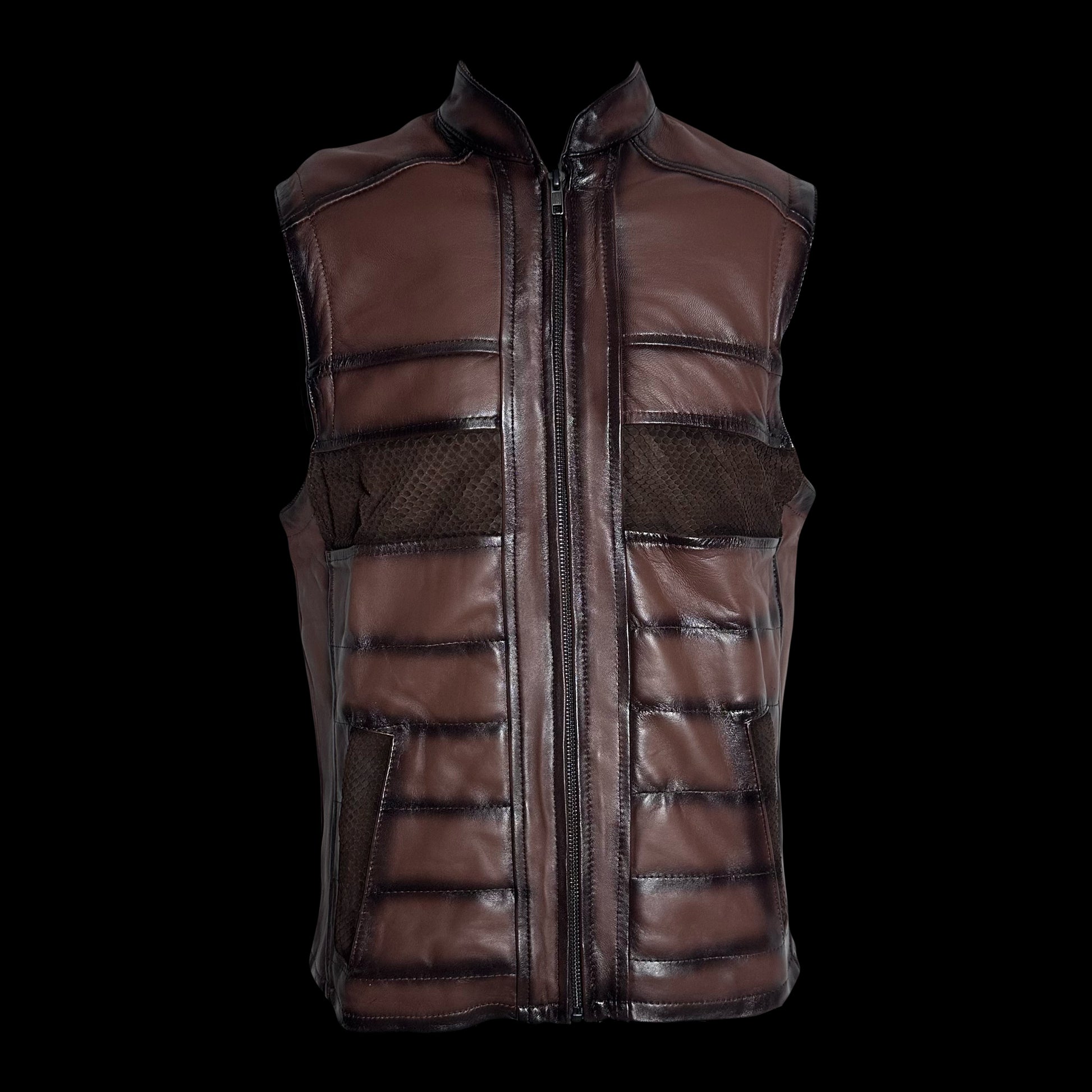 ¡Descubre el chaleco de piel Renato en color marrón! Con su diseño único y sofisticado acabado, esta chamarra añade un toque de estilo audaz a tu guardarropa.