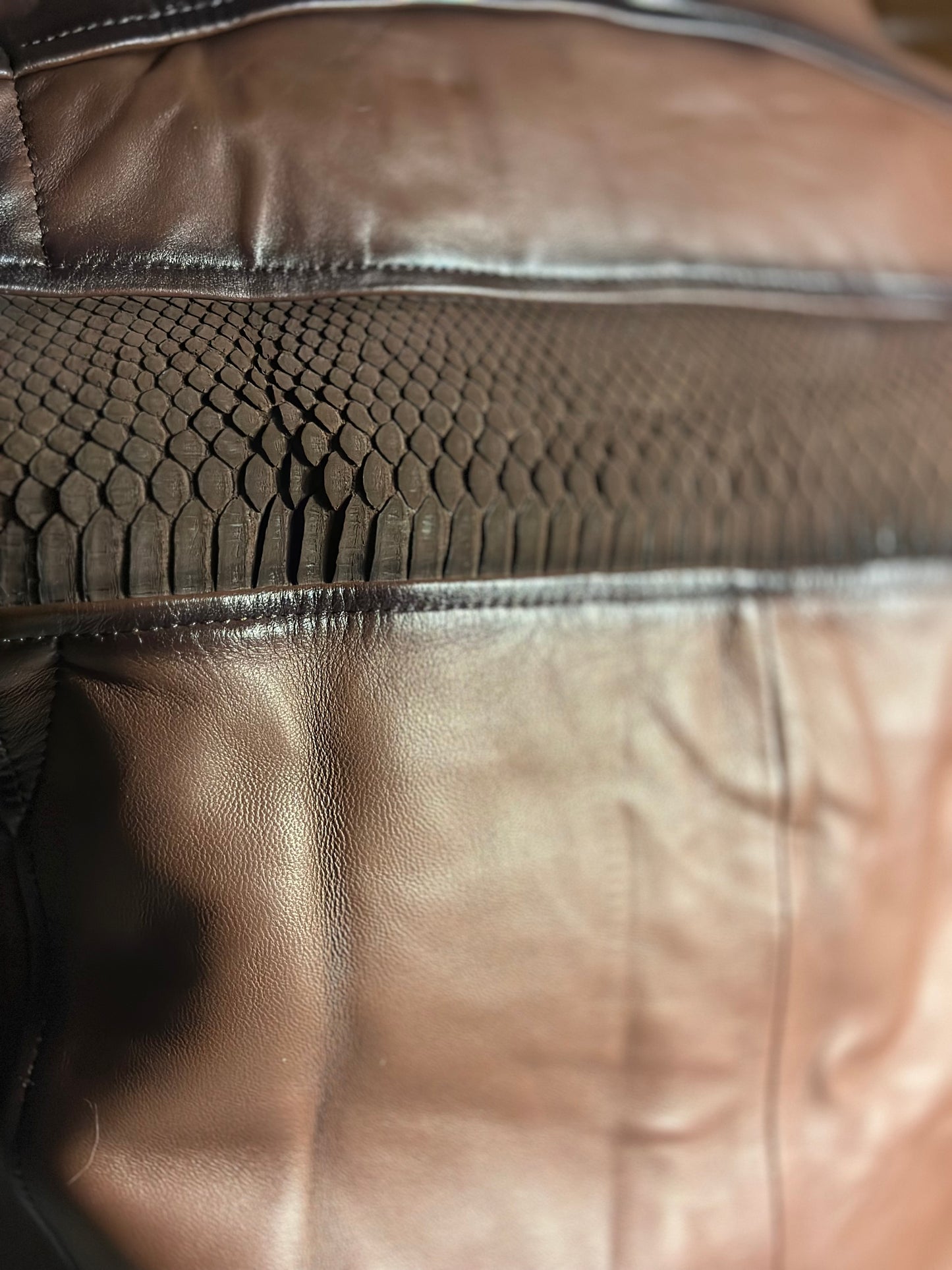 Material: Piel de borrego, forro textil, aplicación de serpiente, cierres y accesorios metálicos.